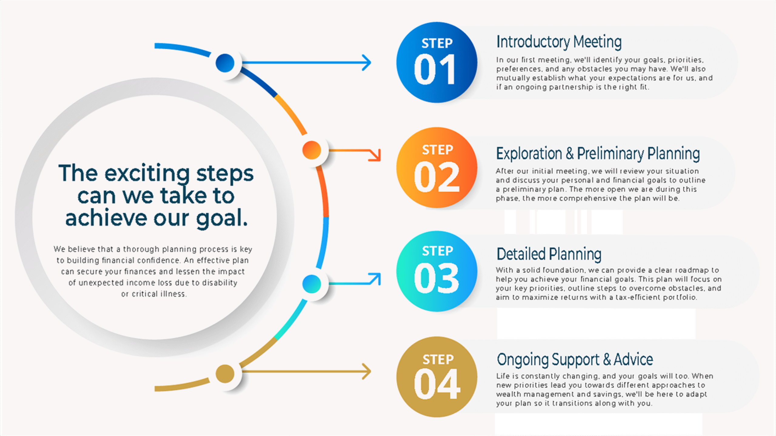 Our journey together begins with getting to know you and your aspirations. Share your vision for the future, and weโll partner with you to craft a personalized plan that truly fits your needs. As life unfolds and your circumstances change, weโre here to adjust your plan so it stays in harmony with your evolving path. Letโs embark on this exciting journey together!